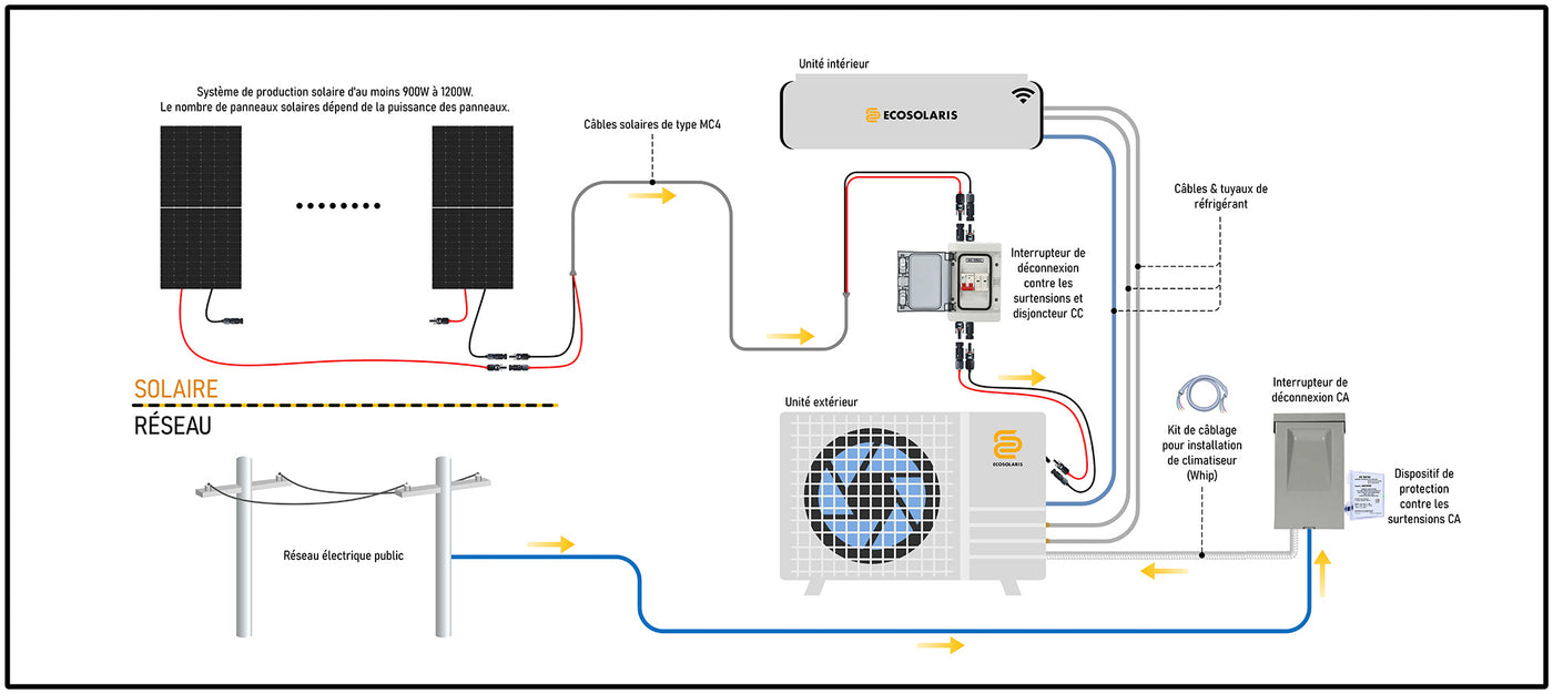 Pour vous aider à comprendre l’installation hybride (solaire/CC + réseau/CA) et à choisir les bonnes composantes, vous pouvez vous référer au schéma d’installation ci-dessous.